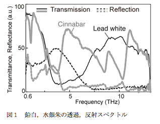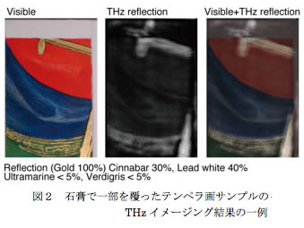 1. はじめに 「私たちがずっと見たくて見られなかったものが,テラヘルツを使うと,作品を痛めずに見えるんです。」これは,先日,あるイベントでFirenzeの修復家が一般の方に伝えていた言葉です。テラヘルツ(THz)技術は,彼らが使いたい道具になりつつあるのです。イントロとして絵画の科学調査についてご紹介しましょう。作品はその保管されている環境(湿度,紫外線等)と時間によって劣化,汚損,損傷を受けます。作品の美しさを後世に伝えるためには,オリジナルの意匠を損なわないよう洗浄,加筆する修復が不可欠で,私たちが美術館で鑑賞している絵画のほとんどは,何世紀にもわたる修復の歴史があります。修復は医療に似ていて,まず作品を科学的に観察,調査し,修復方針を決め,限られた時間内に処置をします。調査は研究所レベルではX線回折による元素分析なども用いられますが,多くの場合は赤外,紫外,X線による写真撮影が用いられます。修復家,あるいは学問として作品を扱う美術史家の判断材料を提供する理系分野が「文化財科学」です。ヨーロッパでは,応用物理系の中に確立された分野で,Louvre美術館の地下では,最先端の計測設備と30人以上の常勤スタッフが,プロトン照射による微量元素分析などを行っています。そんな彼らが見たくても見えなかったものは「X線が透過してしまう物質でできた内部の構造」や「中赤外では見えないニスの下の顔料」です。それらがTHzイメージングで見えるということを,修復家の作業現場で実証してきました。 2. 絵画材料スペクトルデータベース(ライブラリ) 中赤外領域でのユーザー向けスペクトルデータベースは分光器メーカーからライブラリとして販売されています。現状では,THz分光器にスペクトル集はなく,既知の材料のTHz帯での特性を知りたい,という人がユーザーです。文化財分析の分野でも,中赤外,ラマン分光についてはIR Raman Users Group (http://www.irug.org)という,世界各国の美術館,博物館の担当者の団体があり,顔料などのスペクトルを共有しています。3年毎に2百人規模の国際会議を開催し,次回はTHzのセッションをつくる提案があります。NICTでは2007年より絵画材料のTHz帯でのスペクトルを公開し,2008年に理研のデータベースと統合(http://www.thz.org),現在は約300種の絵画材料のスペクトルを掲載しています。図1は古代から用いられている重要な顔料,鉛白と水銀朱の例で,反射,透過ともに特徴あるスペクトルが得られています。絵画材料は,危険物のように特殊ではなく,岩石,土,動植物などが原料で,最近の合成顔料,樹脂は一般の工業製品に用いられているものと同じです。そのためデータベースは文化財関係者だけでなく,地質学,工業化学の関係者にも参考になるはずです。 3. 中世の技法で新しい時代の幕をあけたGiotto 私がテラヘルツ波の特徴を同僚から知らされた時に最初に頭に浮かんだ対象が「テンペラ画」でした。表面が平滑で,中赤外分光では邪魔になるニスが塗布されています。完全反射する金が多用され,ベースの木で充分に乾燥していて,石膏下地の上に,比較的限られた種類の顔料と卵で彩色されています。大きな作品の場合,何枚もの板を金具でつないでおり,これらはX線で充分観察できます。しかし,彩色層の修復を行うためには,石膏下地などの構造が重要なので,許されればサンプリング(破壊検査)により,断面の電子線マイクロアナライザ(EPMA)等による元素分析も行います。それらを有名なエビやSuicaのように,THz波で非破壊,3次元で見せられたら....と思いました。図2は一部を石膏で覆ったテンペラ画サンプルで,金箔,水銀朱,ウルトラマリン,緑青,カーボンブラック,再表面に鉛白を用いたハッチング画法で製作しました。これをPicometrix社に持ち込み,T-Ray4000(周波数範囲:約0.1~2THz)を用いて反射イメージングを行った結果です。反射0%を黒,100%を白としたグレースケールで表しています。石膏はこの周波数ではほとんど透過するため,境界での散乱部分以外は金箔による模様が連続して見えます。また顔料部分に関しては,図1に示すように反射の得られる鉛白,水銀朱は白く現れ,他はほぼ黒になりました。また,画像として記録は残さなかったものの,層構造をしている断面画像が確認できたので,既存技術でテンペラ画を分析できる,という確証を得ました。2008年10月〜2009年2月にFirenzeのGalleria degli Uffizi所蔵の祭壇画Polittico di Badiaが修復される期間を利用して,2008年の12月にT-Ray4000を3日間借用し,THz波による調査を行いました。その結果,図3のように,顔料の下の金箔や,内部構造が非接触で観測でき,修復家達が「見たくても見られなかったもの」を見せることができました。さて,通常のテンペラ画は,ベースの平らな木の上に麻布を膠で張り,彩色の下地としての石膏層があります。しかし,この作品は,ベースの木の凹凸を平らにするための石膏層があり,その上に麻布が張られていました。これこそが,まだ絵画というジャンルが確立していない,祭壇の一部を削って平らにし,彩色する中世の技法です。